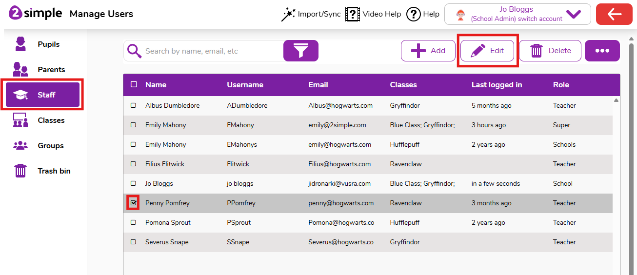 Login to Purple Mash and click on the drop down arrow under your name, select admin settings, then manage users.