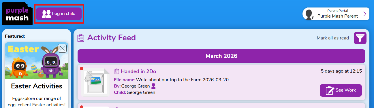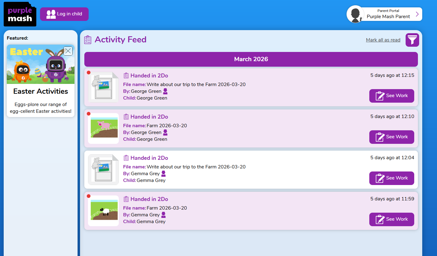 As a parent, you can find out about your child’s learning on Purple Mash and support them beyond the classroom by registering with Parent Portal. Parent Portal allows you to easily see the learning your child has been doing on Purple Mash, including any comments on work from teachers, homework (2Dos), rewards and so much more.