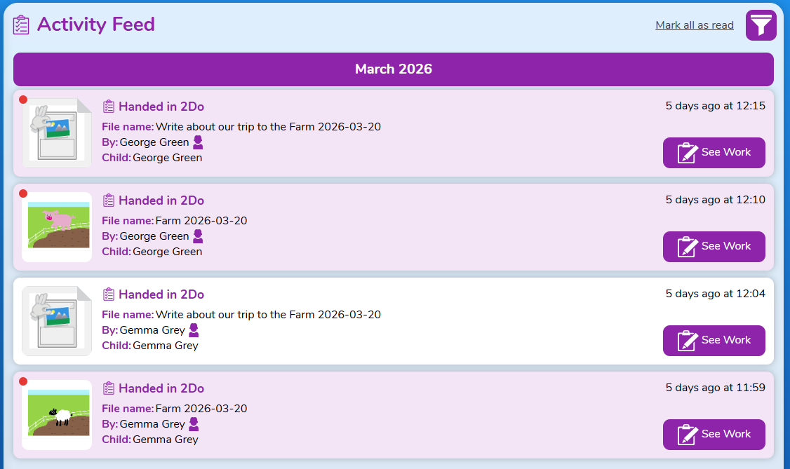 Activity Feed | ![]() The Activity feed shows all the activities associated with a child, with most recent showing first and organised by month. Activity Stream shows: 2Dos set and handed in, approved work for display boards or blogs, rewards given, shared work and commented work. To view any of the work, click the see work button. |