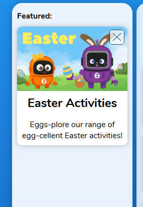 Featured Panel | ![]() The featured panel will show you any featured activities that your child can do in Purple Mash. These are usually seasonal activities. |