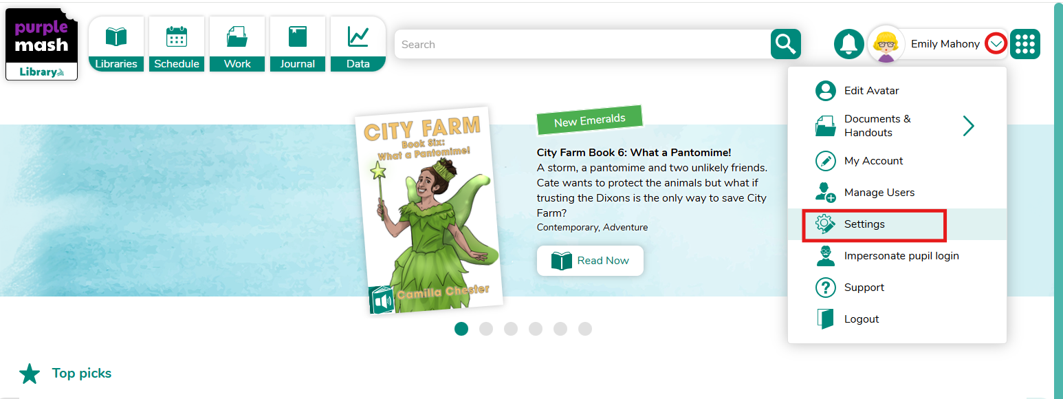 To view the Purple Mash Library settings, click on the drop-down menu next to your name, select settings button.